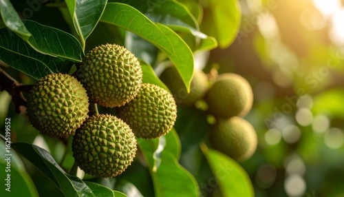 Unripe lychees clinging to a branch, bathed in sunlight, surrounded by lush green leaves.