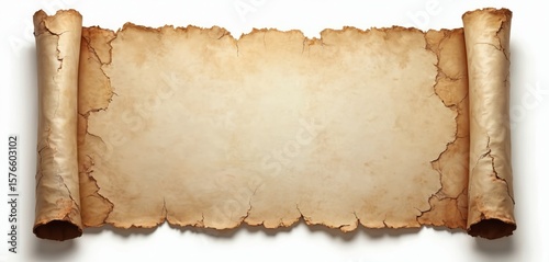 Unrolled old paper scroll, antique parchment with torn, weathered texture. Aged, faded, creased document. Blank surface for writing, drawing, or historical content. Isolated on white background.