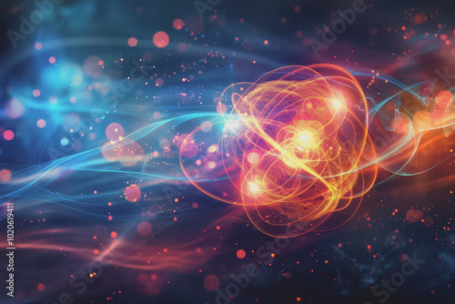 Unstable Atom nucleus with electrons spinning around its technology background.