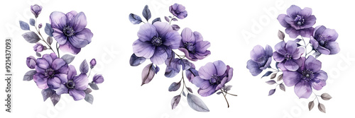 Untitled design - A set of Single hand drawn watercolor purple flower with leaves isolated on a transparent background (2)