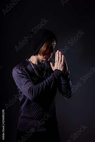unusual freak young guy in black knit cap and red bangs stands in praying pose with hands folded front of face with eyes closed in studio with deep shadows and black isolated background. copy space.