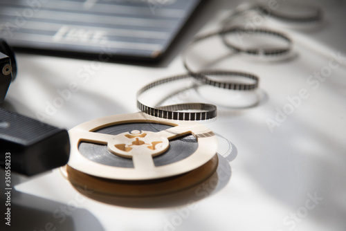 Unwound 8mm film strip on a light background with an old movie camera and clapboard