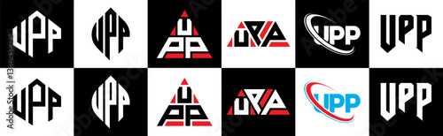 UPP letter logo design in six style. UPP polygon, circle, triangle, hexagon, flat and simple style with black and white color variation letter logo set in one artboard. UPP minimalist and classic logo