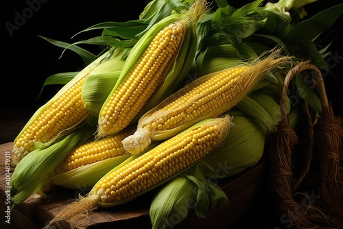 Upper view of corn ears on the right and white side with copy space, generative IA