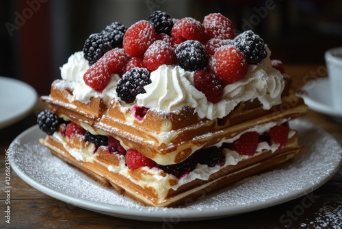 Upscale Dessert Presentation of Delicious Waffle Stack Topped with Fresh Berries and Whipped Cream
