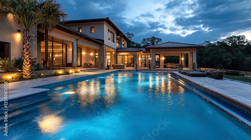 Upscale luxury mansion featuring minimalist architecture large pool with glowing underwater lights evening ambiance tranquil vibe.
