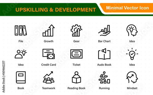 Upskilling and personal development icon pack in outline style. Includes icons for learning, training, education, career, and professional growth.