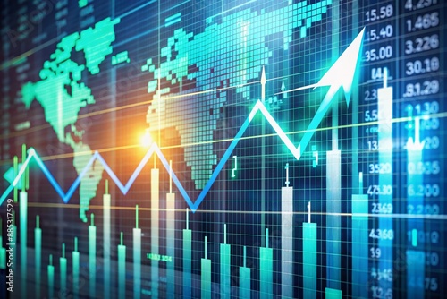 Upward trending arrows and charts on a digital screen display rising stock market numbers and financial growth, symbolizing successful investment and trading strategies.