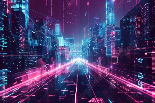 Urban architecture, cityscape with space and neon light effect. Modern hi-tech, science, futuristic technology concept. Abstract digital high tech city design for banner background