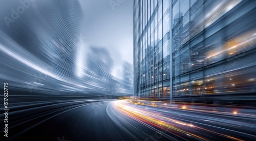 Urban cityscape at night, motion blur of traffic on road. Modern buildings, glass reflections
