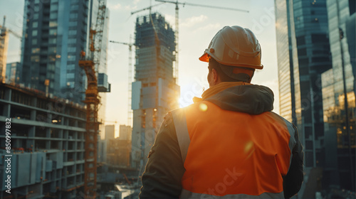 Urban Construction Scene, Engineer Overseeing Skyscraper Development, Modern Cityscape, Architecture Project