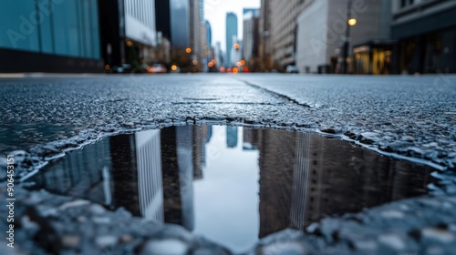 Urban landscape reflected in a water puddle on the street, showcasing a serene moment in a bustling city environment.