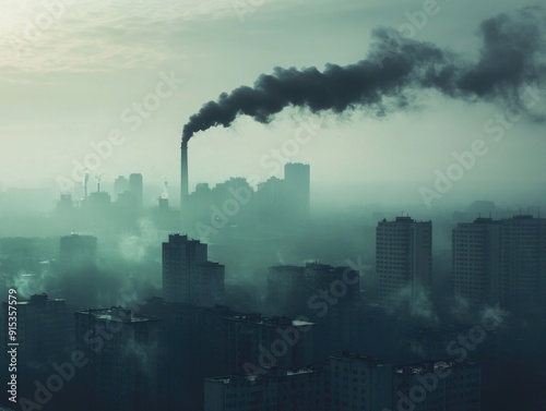 Urban Landscape with Heavy Pollution and Industrial Smoke Emissions during Foggy Day