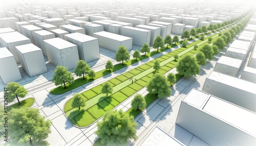 Urban layout design eco-friendly elements. Green spaces, pedestrian zones integrate seamlessly with public transportation routes. Buildings designed around open areas encouraging eco-friendly