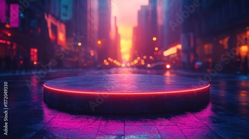 Urban Neon Glow: City Sunset with Futuristic Platform and Vibrant Colors