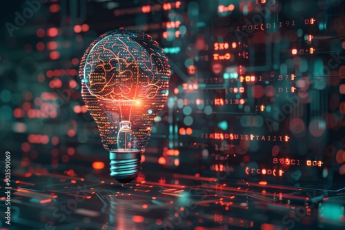 Urban night setting with a light bulb and neural network highlighting the dynamic relationship between modern city life and technological advancement in vibrant hues