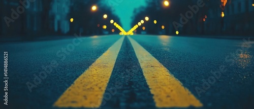 Urban nightscape featuring road markings under street lights creating a moody and atmospheric scene with a focus on perspective and depth of field