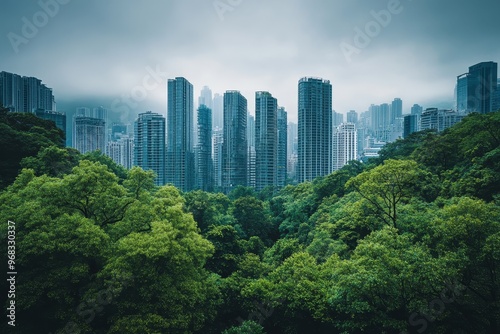 Urban skyline emerging from dense forest, symbolizing harmony between nature and city development