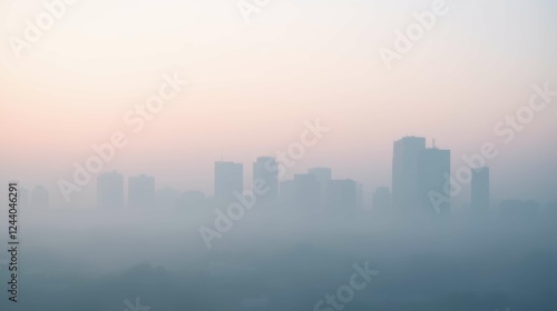Urban Skyline Silhouette in Foggy Dusk Light with Soft Colors