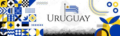 Uruguay Independence Day abstract banner design with flag and map. Flag color theme geometric pattern retro modern Illustration design. Blue and Yellow flag color template.