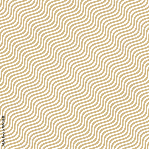 Сurved wavy lines vector seamless pattern. Simple texture with diagonal gold and white waves, stripes. Abstract ripple background, flow, fluid surface, illusion of movement. Repeated golden design