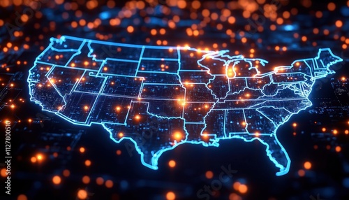 USA Cyber Map with Data Protection Shield and Encrypted City Symbols