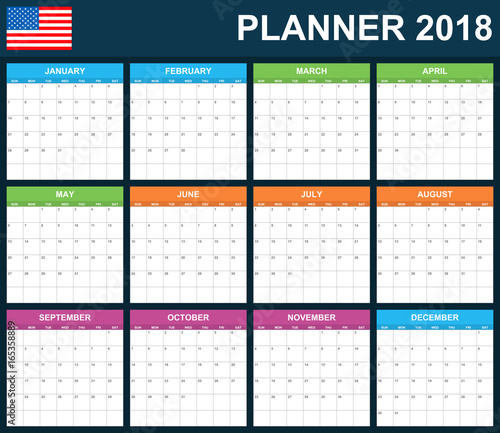 USA Planner blank for 2018. Scheduler, agenda or diary template. Week starts on Sunday.