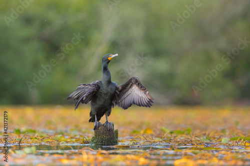 USA, Washington State. A Double-crested Cormorant (Phalacrocorax auritus) spreads its wings to dry. Seattle.