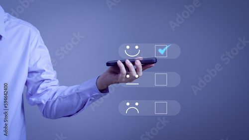 User give rating to service experience on online application, answer questionnaire And give satisfaction scores, satisfaction survey and customer service Concept.