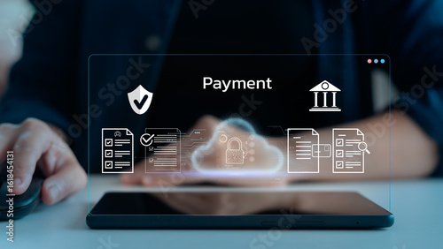 User managing secure online payment with cloud system, digital lock, and financial document icons. Concept of fintech, e-payment, and encrypted transactions.