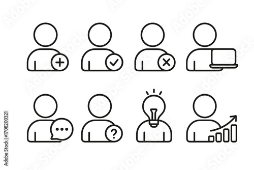 User profile icon set thin line vector. Collection of outline signs for web, app. Add, delete, approve user. Chat, help, idea, analytics, business growth avatar symbols.