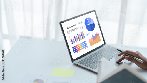 Using calculator and laptop, Close up hands of asian bookkeeper female working with stack of papers and balance sheet with bureaucracy hardworking in office desk.