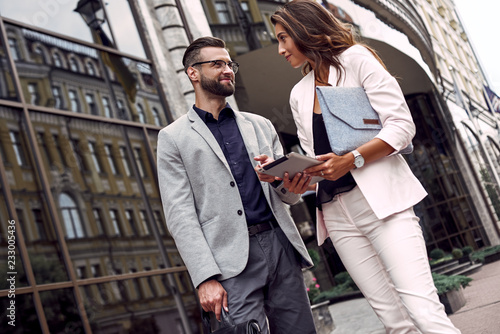 Using gadget. Two young business people standing outside on the city street using digital tablet checking latest news smiling joyful