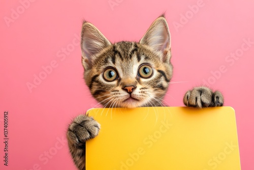 Сute cat european shorthair hold in front paws a layout - large yellow avenue sign. Cat on poster mockup. Isolated kitty on a solid dress code pink background. Cat display mockup. Cat photo.