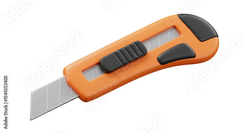 Utility cutter knife with sharp retractable blade in orange and black color used for cutting materials isolated on a transparent background, png, cutout.