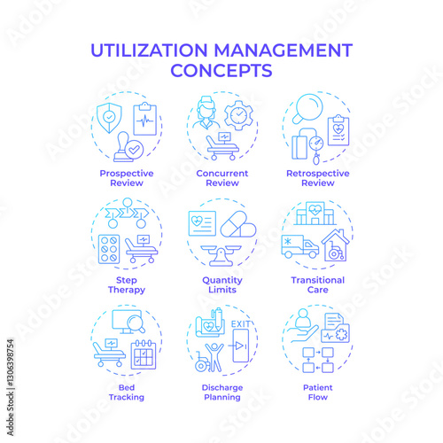 Utilization management blue gradient concept icons. Medical service regulation strategy. Healthcare service. Icon pack. Vector images. Round shape illustrations for presentation. Abstract idea