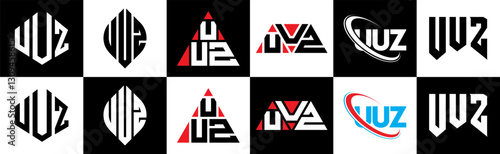 UUZ letter logo design in six style. UUZ polygon, circle, triangle, hexagon, flat and simple style with black and white color variation letter logo set in one artboard. UUZ minimalist and classic logo