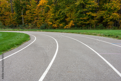 vacant sports track with white lines curving into autumn trees