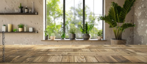 Vacant wooden table in the background of a blurred room interior. Copy space image. Place for adding text and design
