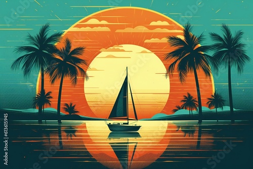 Vacation, summer sunset, retro and modern style, for a greeting card Generative AI
