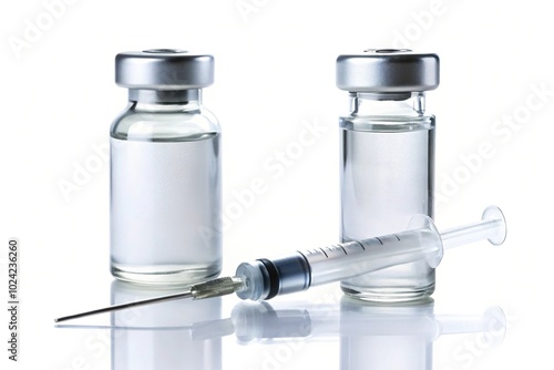 Vaccine vial bottle and syringe isolated on white background with copy space Fisheye