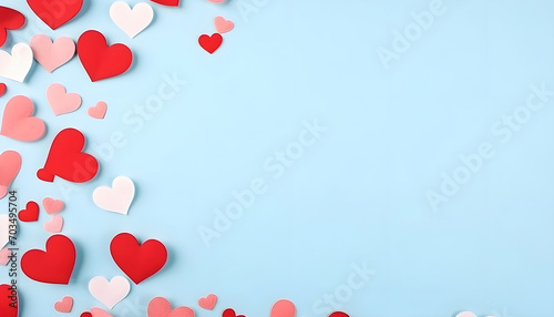 Valentine day festive invitation with paper red hearts pattern and empty blank on pastel blue background top view