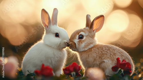 Valentine rabbit with romance and joy idea. Adorable rabbits sharing a tender moment in a floral setting