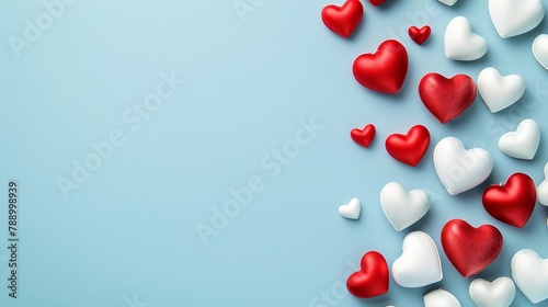 Valentines Day background White and red hearts on pastel blue background Valentines day concept Flat lay top view copy space : Generative AI