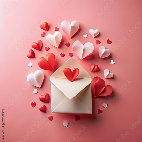 Valentine's Day composition, paper hearts, origami hearts, pink envelope, red and white color scheme, 3D paper art