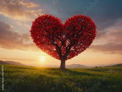 Valentine's Day Heart Shaped Tree with Red Leaves at Sunset as Background