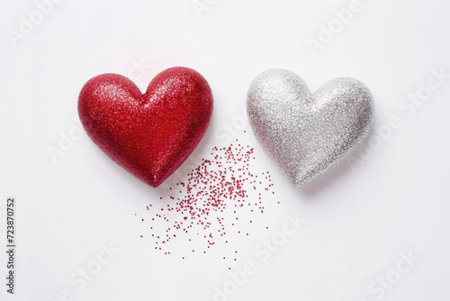 Valentine's Day. Red and silver glitter hearts on white background. Space for text.