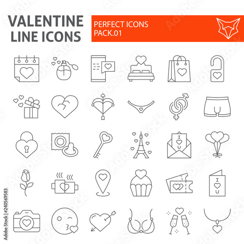Valentines day thin line icon set, romantic symbols collection, vector sketches, logo illustrations, love signs linear pictograms package isolated on white background.