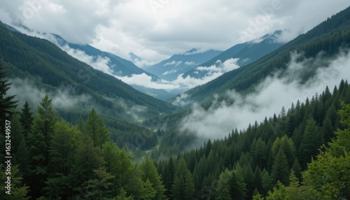 Valley of Misty Green Forest Encircled by mountains in a picturesque setting with a cloudy sky