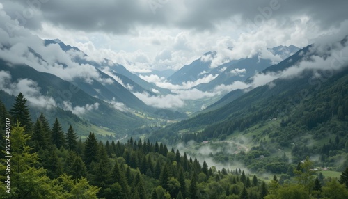 Valley of Misty Green Forest Encircled by mountains in a picturesque setting with a cloudy sky